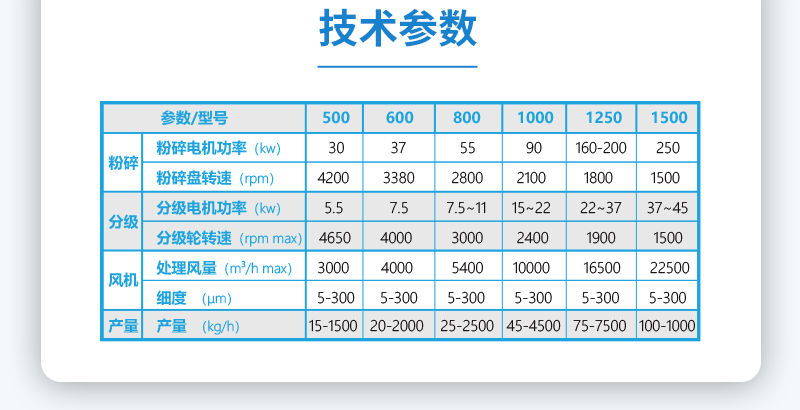 内含分级装置,产品粒度D90:10-45微米之间可调,粒形好,粒度分布窄。